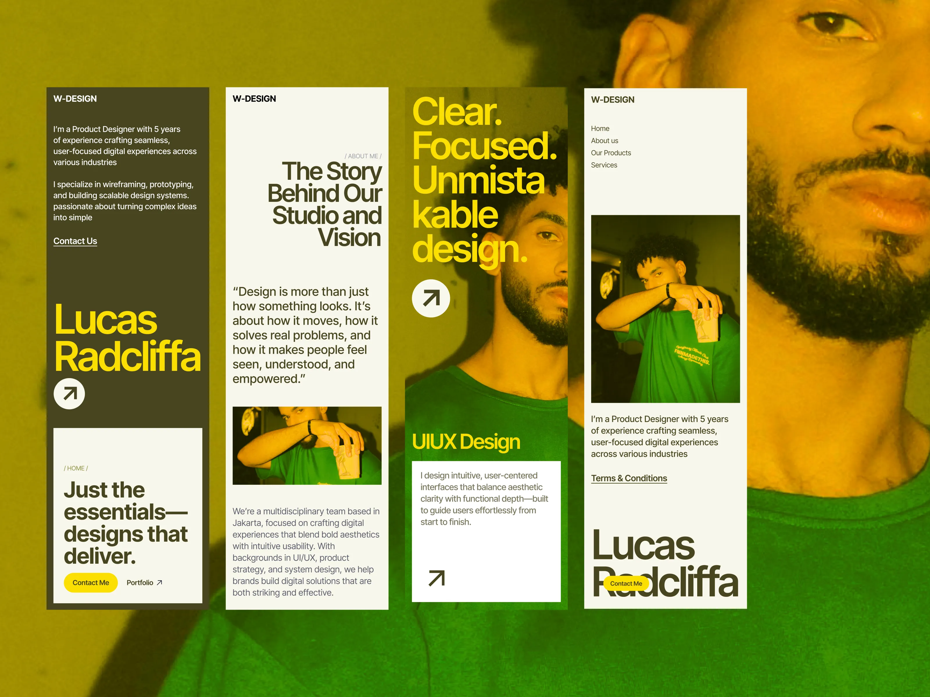 I designed it as a conversation with the visitor — direct, bold, and confident. The typography shouts my name unapologetically, while high-contrast colors inspired by editorial posters give it striking energy. The whole site flows like a magazine cover you scroll through, with each section unfolding like a feature spread.