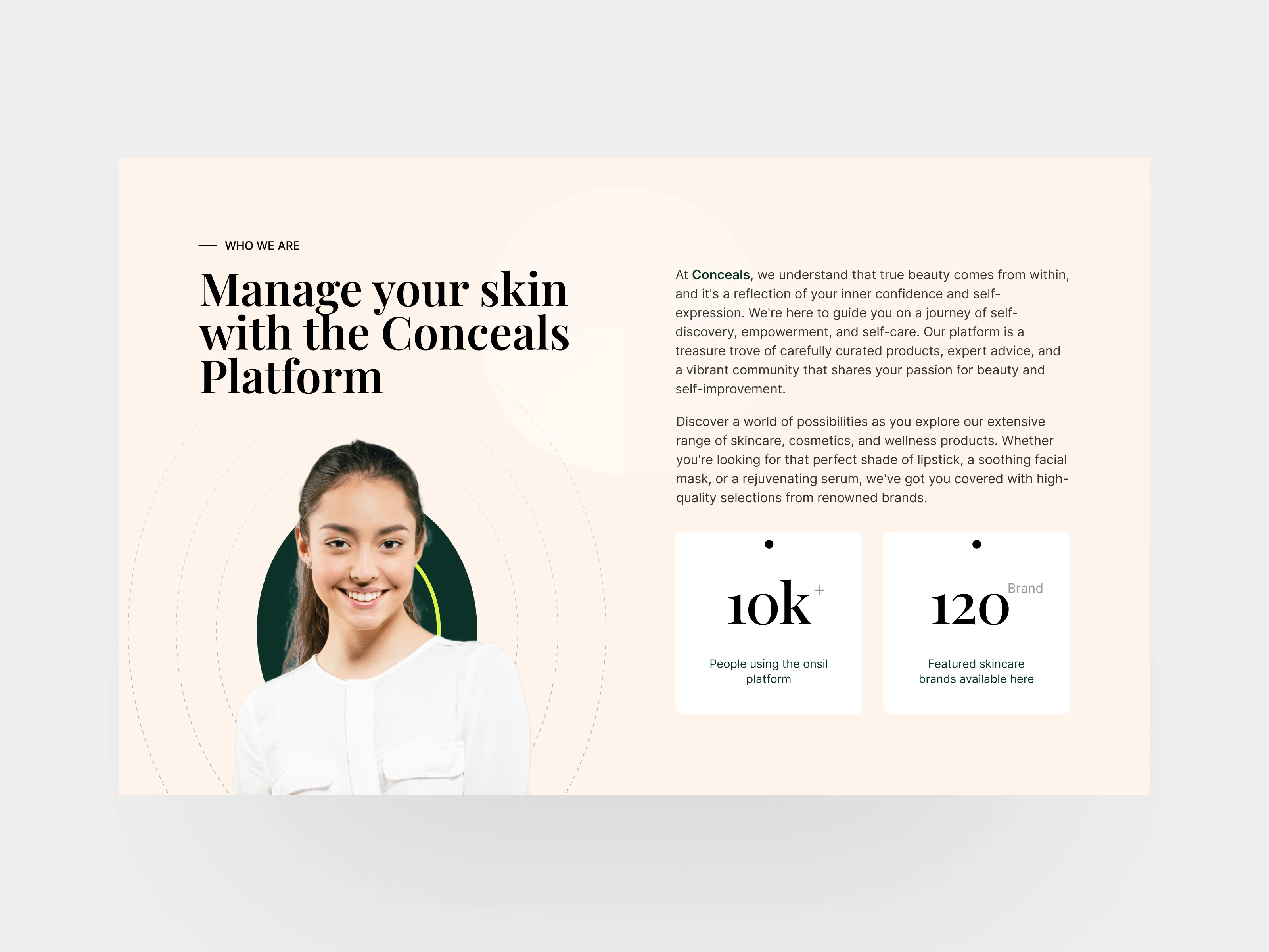 This is a "Conceals Landing Page for Customer" not just selling products, but stepping in as your skin's health buddy! This App's got some AI magic up its sleeve to recommend just right beauty brews for your skin. Just snap a selfie, and let the AI play detective on your skin's radiant journey!